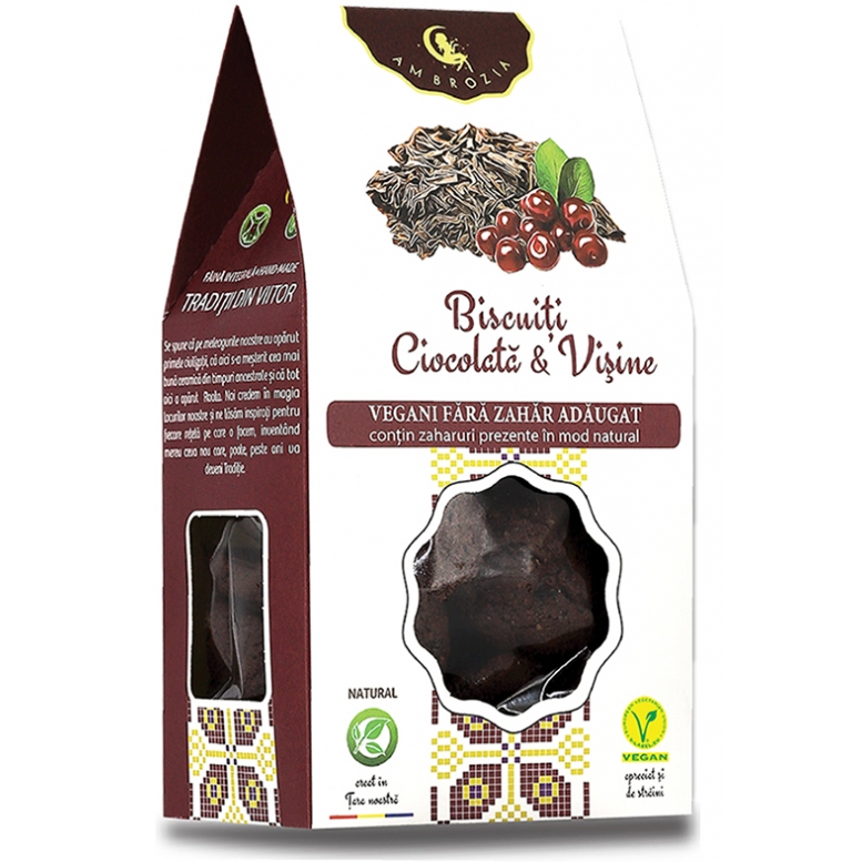 Ingrediente: must din struguri, făină integrală de grâu, ulei de cocos, vișine deshidratate (10 % ), pudră de cacao cu conținut redus de grăsime, ciocolată naturală (masă de cacao 72%, nectar granulat din flori de cocos, unt de cacao), vanilie naturală.
