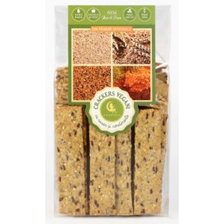 Ingrediente: faina integrala de grau, faina integrala de grau spelta, ulei de floarea soarelui presat la rece, seminte de susan (11%), seminte de in, sare de mare fara adaos de iod, amestec de condimente (2%): busuioc, oregano, cimbru, rozmarin, curry (in proportii variate).