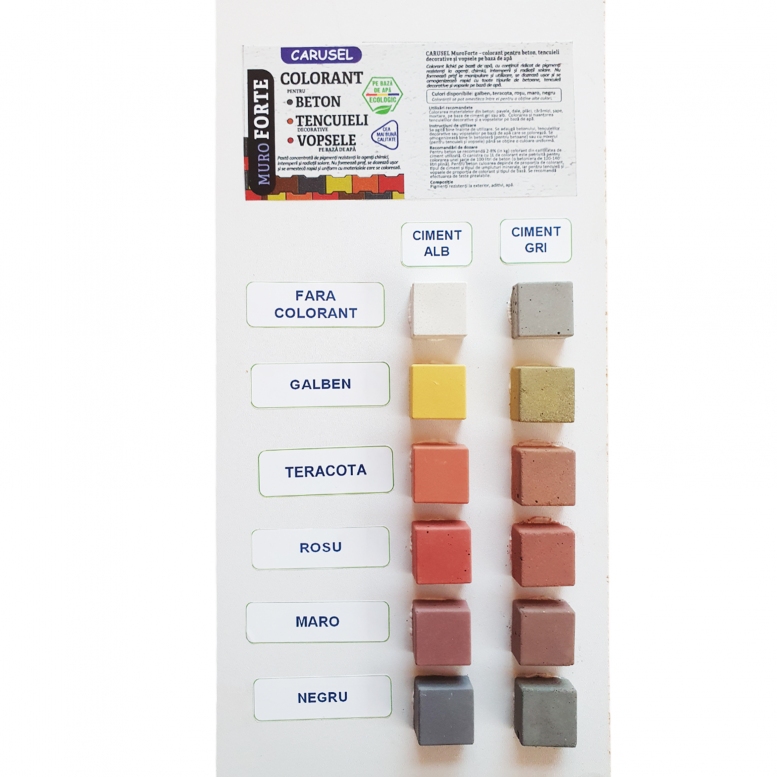 Colorarea materialelor din beton: pavele, dale, placi, caramizi, sape, mortare, pe baza de ciment gri sau alb.
