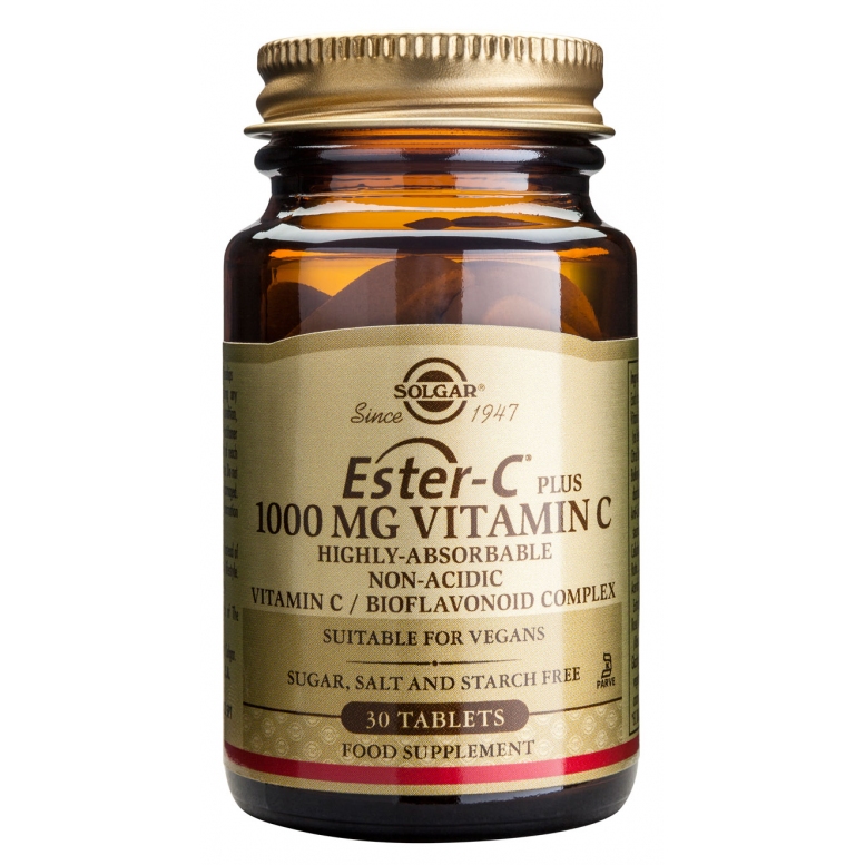 Vitamina C este o vitamina antioxidanta esentiala sanatatii organismului, fiind in special importanta pentru mentinerea sanatatii pielii. Functia sa primara este aceea de a contribui la sintetizarea colagenului, o proteina necesara pentru formarea pielii, ligamentelor, oaselor si dintilor, cat si pentru intarirea peretilor vaselor de sange. In plus, vitamina C joaca un rol important in absorbtia fierului, care este necesar pentru formarea celulelor rosii. De asemenea, are un rol in utilizarea fierului si acidului folic, una dintre vitaminele complexului B. Este bine-cunoscut faptul ca Vitamina C se distruge prin procesarea alimentelor in mai mare masura decat orice alta substanta nutritiva. Este de asemenea de notorietate faptul ca organismul nu depoziteaza vitamina C, avand tendinta de a excreta cantitati excesive.Ester-C ® reprezinta o forma inovativa de vitamina C, care include de asemenea si metabolitii vitaminei C. Acesti metaboliti ajuta vitamina C sa patrunda in sistemul circulator mai repede, in cantitati mai mari si cu pierderi mai mici. In plus, metabolitii Ester-C ® ajuta vitamina sa penetreze celulele albe mai eficient. Celulele albe, dupa cum este bine-cunoscut, necesita niveluri ridicate de vitamina C in procesul lor metabolic. Astfel, Ester-C ® sustine rolul crucial al celulelor albe in sistemul imunitar. Ester-C ® se absoarbe de aproximativ patru ori mai mult, se activeaza de doua ori mai repede si ramane in sange de doua ori mai mult timp decat vitamina C normala.Produsul poate fi consumat de vegetarieni.A se administra ca supliment alimentar pentru adulti, o (1) tableta pe zi, preferabil in timpul mesei.Fiecare tableta asigura: Vitamina C (sub forma de Ester-C®, ascorbat de calciu) 1000mgComplex de bioflavonoide din citrice 200mg Guma de celuloza, Rutina 25mgExtract din pudra de fructe Acerola (Malpighia glabra) (4:1) 25mgPudra de macese (Rosa canina) 25mgAmbalaj: 30 tablete